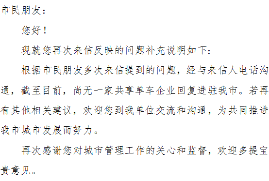 附:本来想将这个建议提交给城市管理局,但考虑自行车并不仅仅只是涉及到城市管理这一个方面,它同样也是城市立体化交通、数字城市的一部分,所以烦市长信箱转交给电子政务办(大数据办?)、市交通管理局和市城管局。